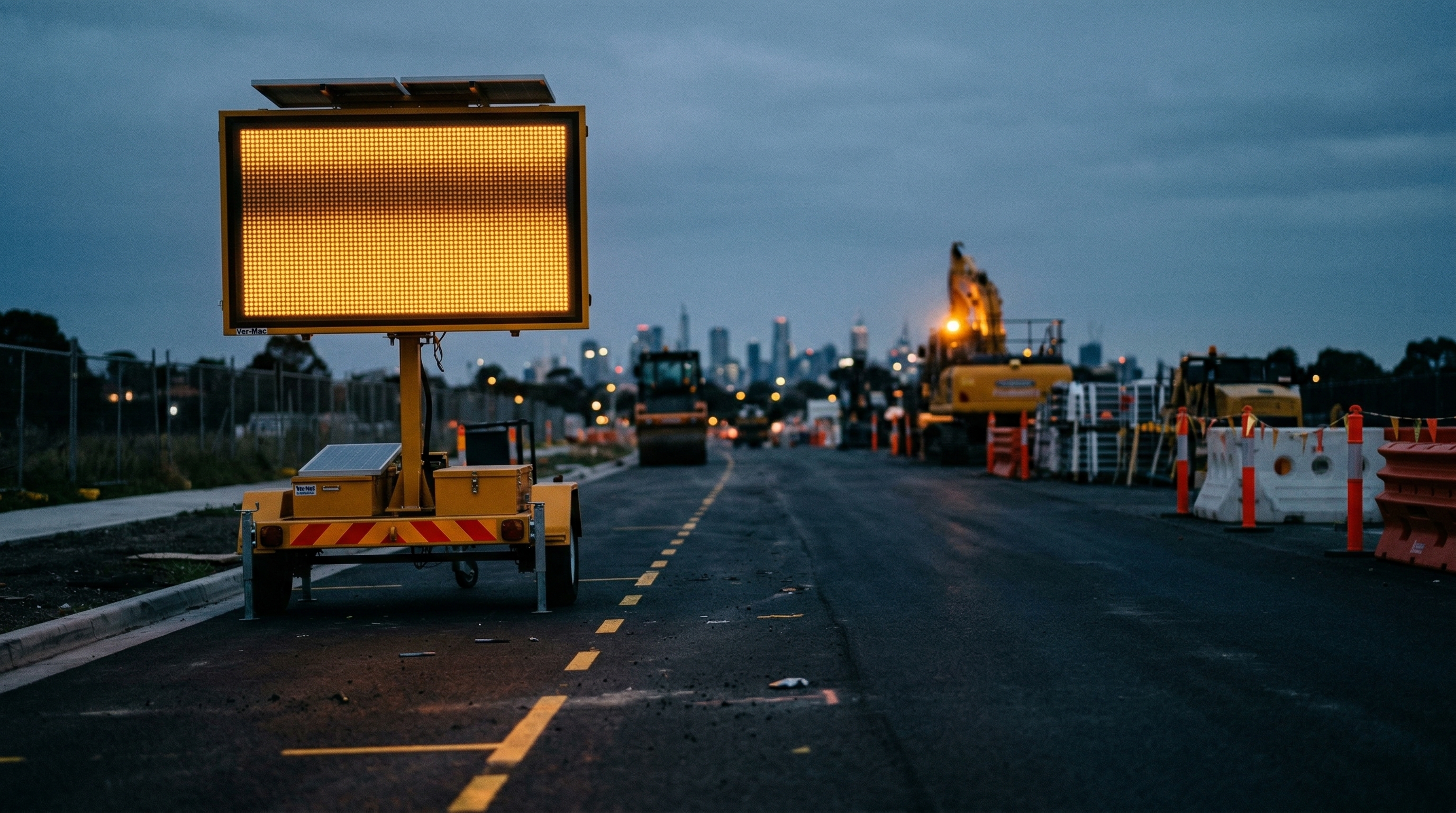 AS 4852.2-compliant solar-powered boards for roadworks, detours, and traffic management plans across Melbourne.